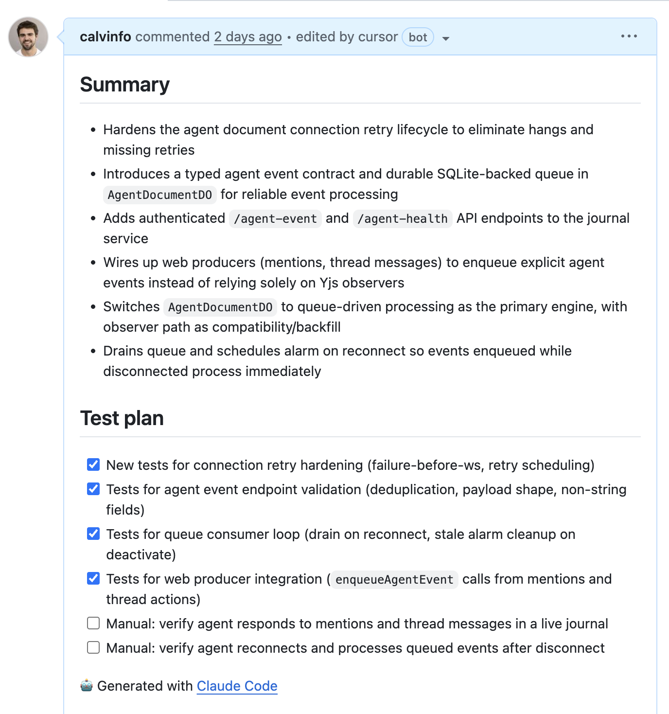 Cursor Bugbot and Codex Code Review -- I still spot-check the code, and make sure I understand it from an architecture level, but increasingly I am not reading every line of every PR. I rely on agents to spot subtle bugs (they are far better at it than I am). For awhile I was using Claude Code, Cursor's Bugbot, and Codex. Claude Code didn't seem to catch real issues for me. Since then, I've settled mostly on Cursor as the default option since you can tell when it's working, though I find the results of Codex are good too.